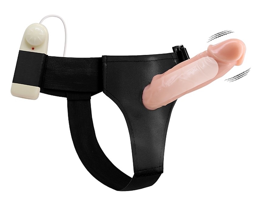 Esta popular correa de consolador con vibrador incluye poderosas vibraciones.