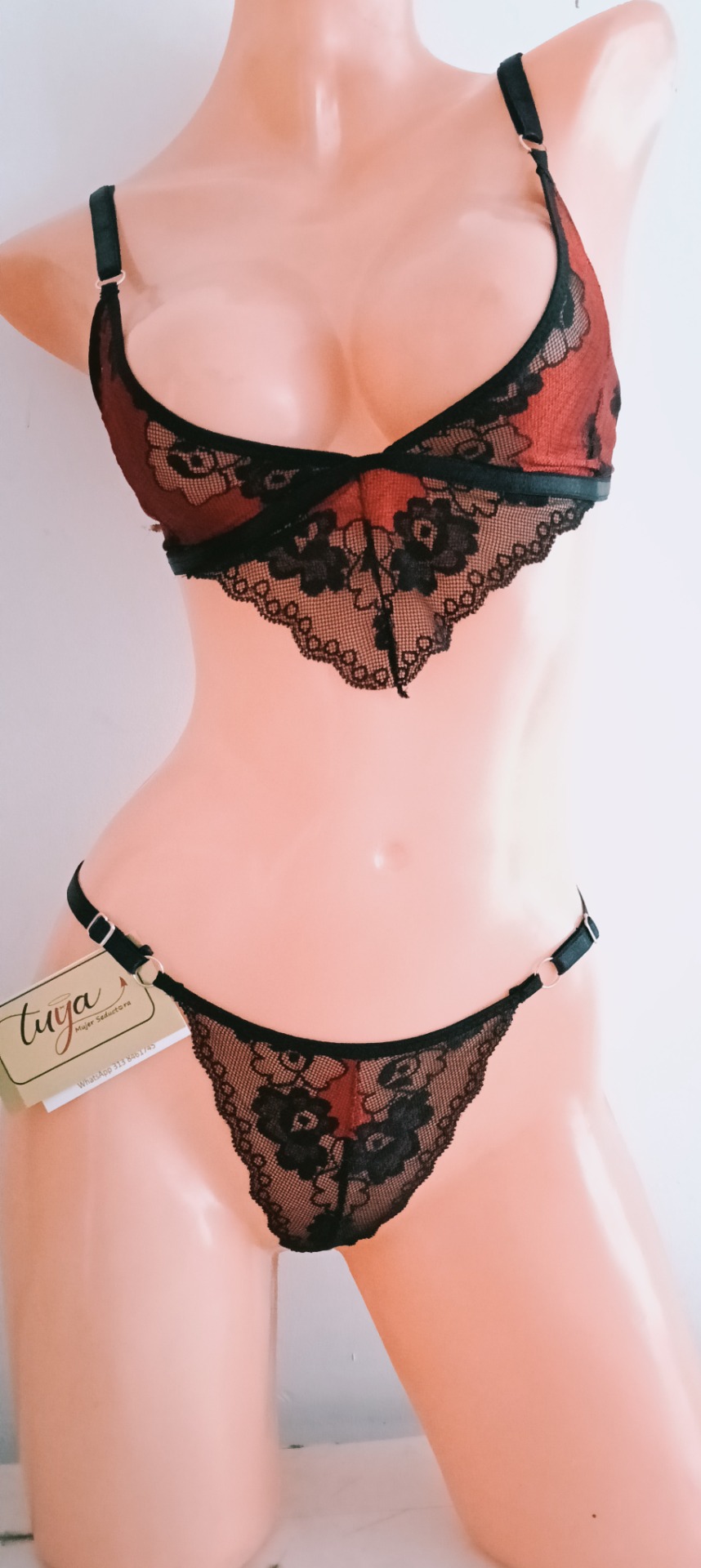 Conjunto en encaje estampado, rojo-negro. Panty graduable en la cintura.